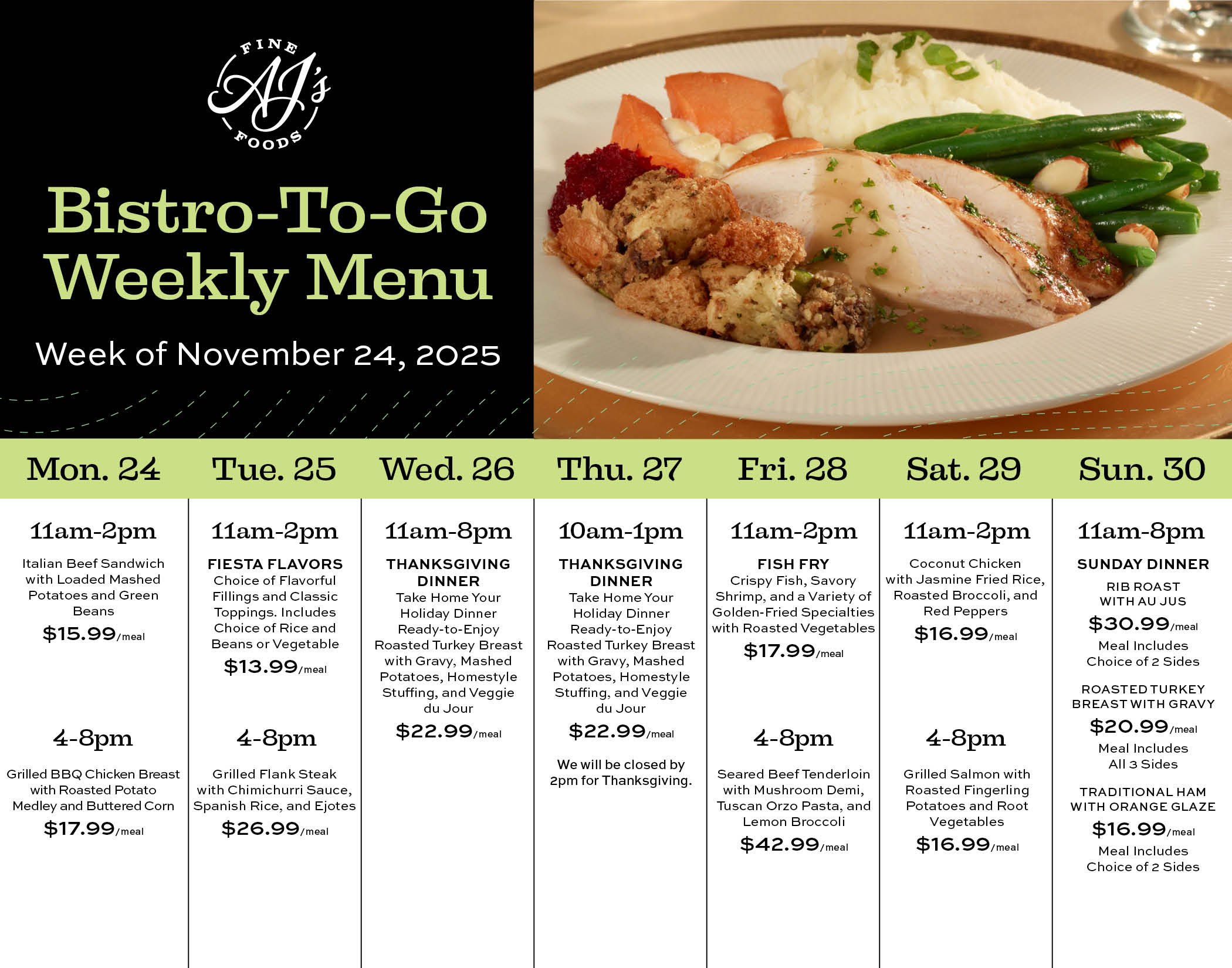 AJ’s Chefs have lunch, dinner, and side dishes ready for you to enjoy. Ask about wine and dessert pairings to make it a complete dining-at-home experience.
