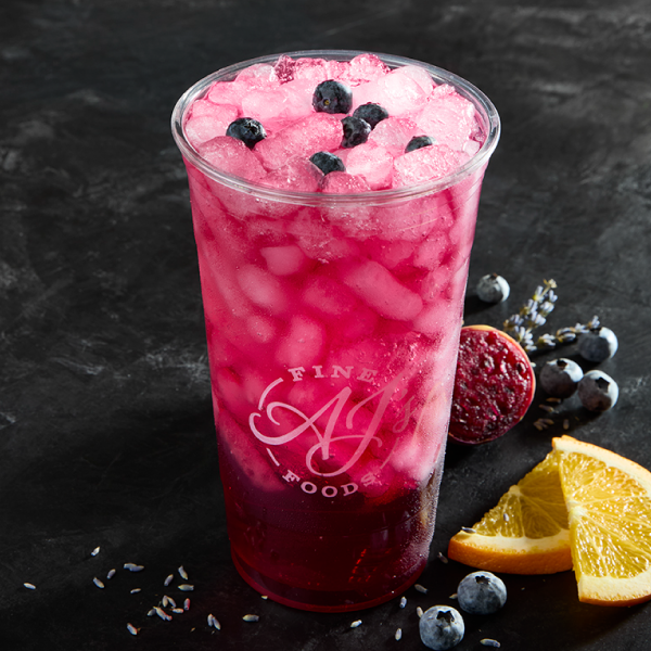 Indulge in a refreshing blueberry lavender tea paired with prickly pear and lavender syrups and garnished with blueberry and orange.